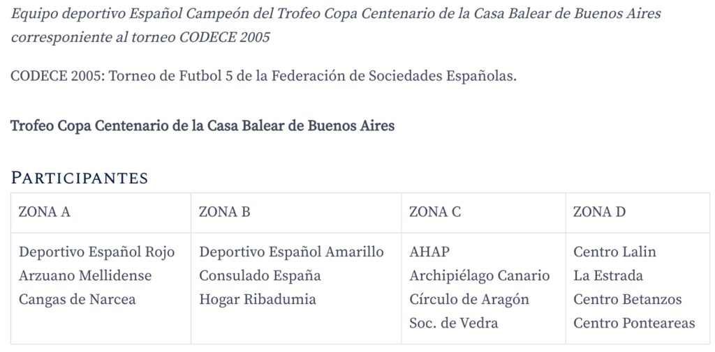 31/12/2013 Durante el 2013, se celebró la XI edición de las Competencias Deportivas de la Colectividad Española (CODECE), organizado por la Federación de Sociedades Españolas de Argentina, a través de su Subcomisión de Deportes. Estas competencias cuentan con una gran variedad de deportes y juegos de mesas con el objetivo de integrar a los socios